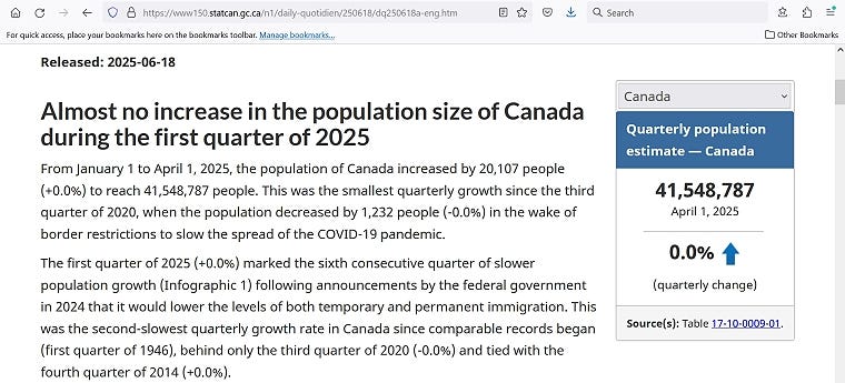 Despite the Century Initiative’s mass-immigration plan, Canada’s population, for the first time ever, decreased in 2025. In Q1, the population of Canada zeroed out: