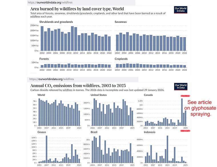 Forest fires are not on the rise, as you see below, and more to the point, the fact that Canada seems like an outlier here, may very well be attributed to the spraying of Glyphosate, that some local and provincial governments are allowing. Patricia Conlin is taking a lead on this in Scugog (the next municipality over in my Region) and I hope to have more on this soon.