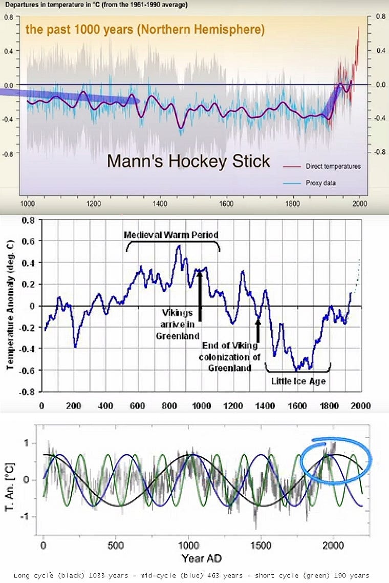 My suggestion was that our Environment committees, might best serve the residents of this Region, and other Regions, by looking into subjects of this nature, the use of glyphosate and biosludge on farms lands, micro plastics and ‘forever chemicals’ in water, etc., rather than arguing over CO2. As one astute Committee member put it, “you can find a chart to prove anything you want.” Exactly. . . And, if you torture the numbers long enough, you can make them say anything you want. Everyone is familiar with that famous ‘Hockey Stick’ temperature chart, of course, that reaches from the present day back to 1000 AD. As you see below though, this chart is conveniently cherry-picked to exclude the 800s and the Roman era (2000 years ago) — where temperatures were as high, or higher, than today. If we go back to the Holocene, the temperatures were higher still. These are random charts I’ve had on my computer for some time, but there are plenty of others to be found on line, to compare.
