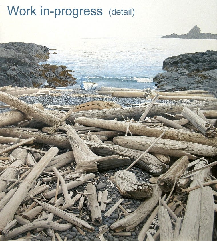 I need to get back to my easel now, to escape for a while, and dream of a summer trip to Haida Gwaii. Below, as you’ll see, is a larger picture of my latest painting (still just a detail): ‘Driftwood Beach.’
