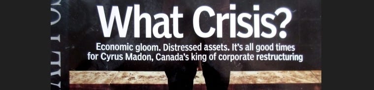 It is obvious, after three consecutive Liberal (Globalist) regimes, that the dismantling of Canada (and the selling off of its assets) is moving into high gear, thanks to Brookfields’ bankruptcy specialists — and now Brookfields’ ‘Prime Minister.’ While cleaning up my studio a few days ago, as it happens, I came across a copy of the Financial Post Magazine, December 2008 (in the midst of last financial Crisis). A smug ‘Senior Manager of Brookfield Asset Management’ graces the cover. Ah, those money magicians! They’re laughing at us. . . all the way to the bank: Crisis?